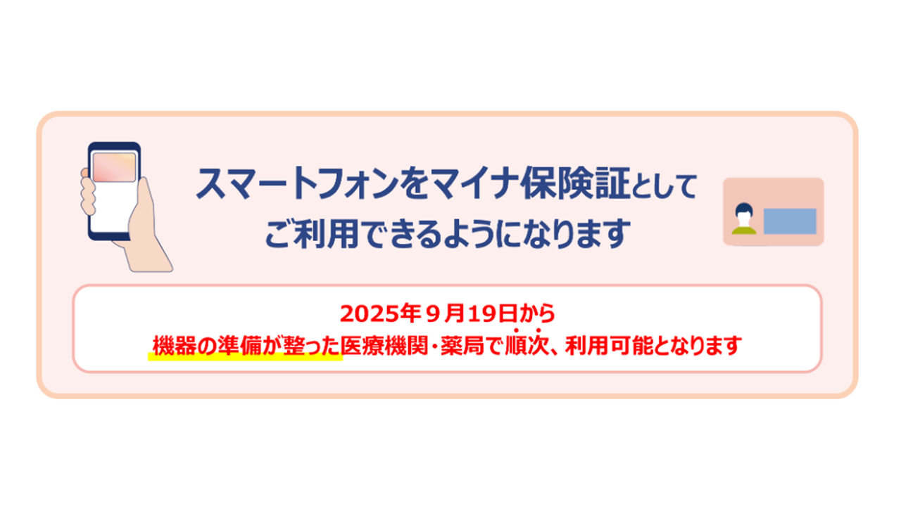 本年6月より、iPhone でのマイナンバーカード機能の利用が開始されたことを踏まえ、スマートフォンでのマイナ保険証(健康保険証の利用登録がなされたマイナンバーカード)の利用に向けて、令和7年9月19 日より、利用環境が整った医療機関・薬局において、順次スマートフォンでのマイナ保険証によるオンライン資格確認が開始され、これにより、実物のマイナンバーカードだけでなく、スマートフォンでも保険診療が受けることが可能となります。